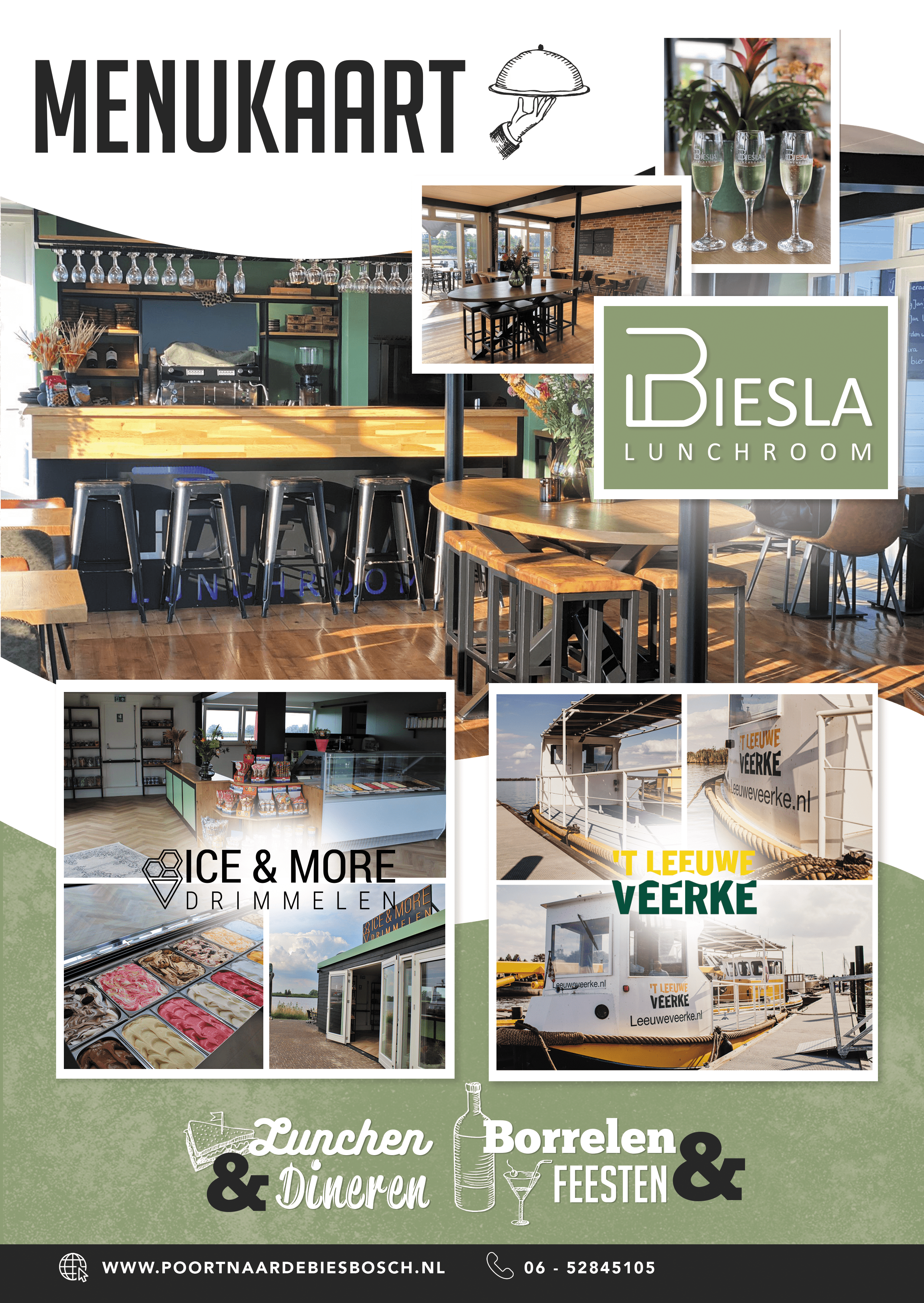 In onze vernieuwde lunchroom Biesla, de naam is een samentrekking van ‘ Biesbosch’ en ‘Lage Zwaluwe’ , serveren wij u o.a. koffie met gebak, luxe broodjes en tosti’s en andere heerlijke versnaperingen om te borrelen!